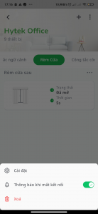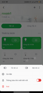 Tại màn hình phòng điều khiển chọn biểu tượng ứng dụng sẽ hiện ra danh mục các cài đặt, chọn biểu tượng thùng rác để xóa thiết bị. Ở mục “Thông báo khi mất kết nối” bật công tắc để nhận thông báo khi thiết bị mất kết nối mạng.