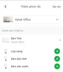 - Trong cửa sổ thêm phím tắt nhấn vào mũi tên để chọn phòng sau đó chọn thiết bị và nhấn vào biểu tượng + để thêm công tắc vào màn hình chính và biểu tượng – để gỡ.